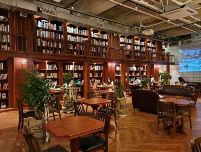 군데군데 보이는 식물 덕분에 쾌적하고 편안한 분위기가 한층 업그레이드되는 공간인 것 같습니다. 벽면을 가득 채운 책들로 인해 마치 스터디 카페를 연상시키기도 하고 영국의 도서관 같은 느낌을 주는 것 같습니다. 공간이 넓은 편이고 테이블끼리 간격도 있어서 오랜 시간 머물면서 작업을 하기에도 적합한 분위기인 것 같습니다.