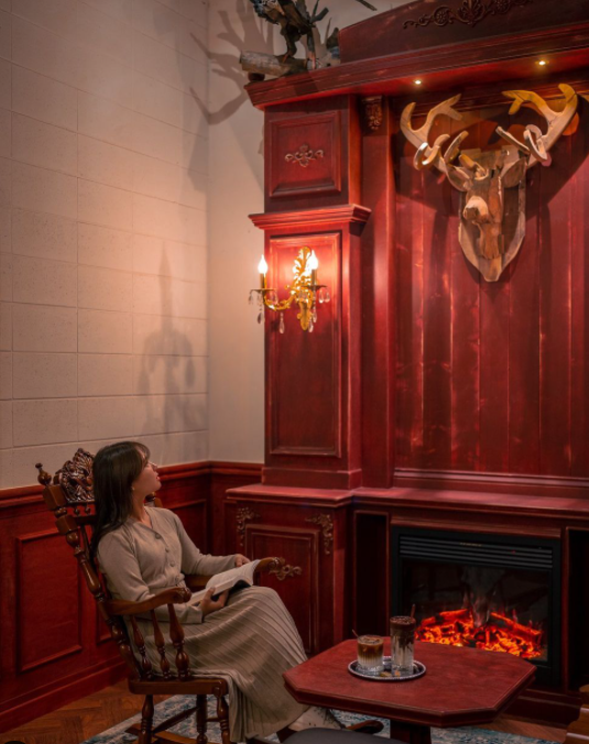이곳의 포토존이라고 할 수 있는 공간인데요. 마치 부잣집 거실에 있는 듯한 느낌을 받을 수 있는 벽난로 인테리어의 흔들의자는 다양한 모습을 연출할 수 있는 공간인 것 같습니다. 가장 인기가 많은 스폿이라고 하는데요. 아마 오픈에 맞추어 가시면 자리를 잡을 수 있지 않을까 하지만 평일에도 사람이 많은 맨홀커피라고 하니 틈틈이 기회를 노려봐야겠습니다.