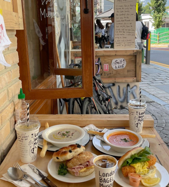 보기만 해도 힐링이 되는 베이글 메뉴, 마치 런던 거리에 앉아있는 것 같은 느낌을 주는데요. 얼른 이 시국이 끝나서 진짜 런던 거리에 앉아서 맛있는 베이글을 먹을 수 있는 그날을 상상해 봅니다. 찍는 곳마다 포토존에 맛과 분위기까지 다 갖춘 안국역의 런던 베이글 뮤지엄이었습니다.