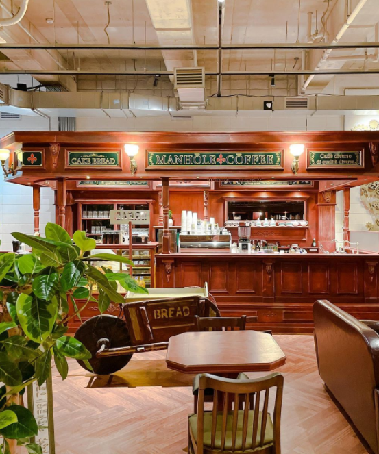 이번에는 영국 감성의 킹스맨 분위기를 느낄 수 있는 서울 당산의 맨홀커피입니다. 가오픈 때부터 인기가 엄청났다는 이곳은 당산역 아파트 상가 지하에 위치해 있는데요. 지하라 하면 답답한 느낌이 있을 것이라는 편견이 있지만 이곳은 층고가 높고 우드톤의 인테리어로 지하의 삭막함을 한 번에 없애주었습니다.