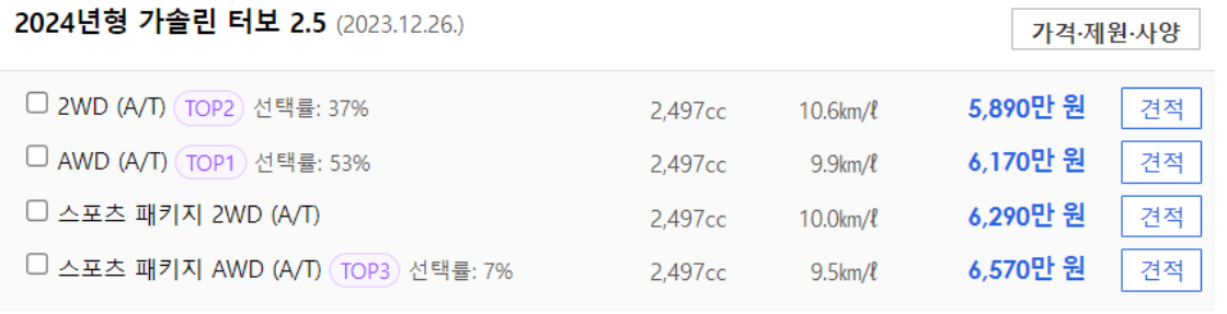 이 중 소비자들에게 인기가 가장 높은 가솔린 터보 2.5 모델은 5,890만 원에서 6,570만 원이고 가솔린 터보 3.5 모델의 가격은 6,550만 원에서 7,390만 원으로 책정이 되어 있습니다.