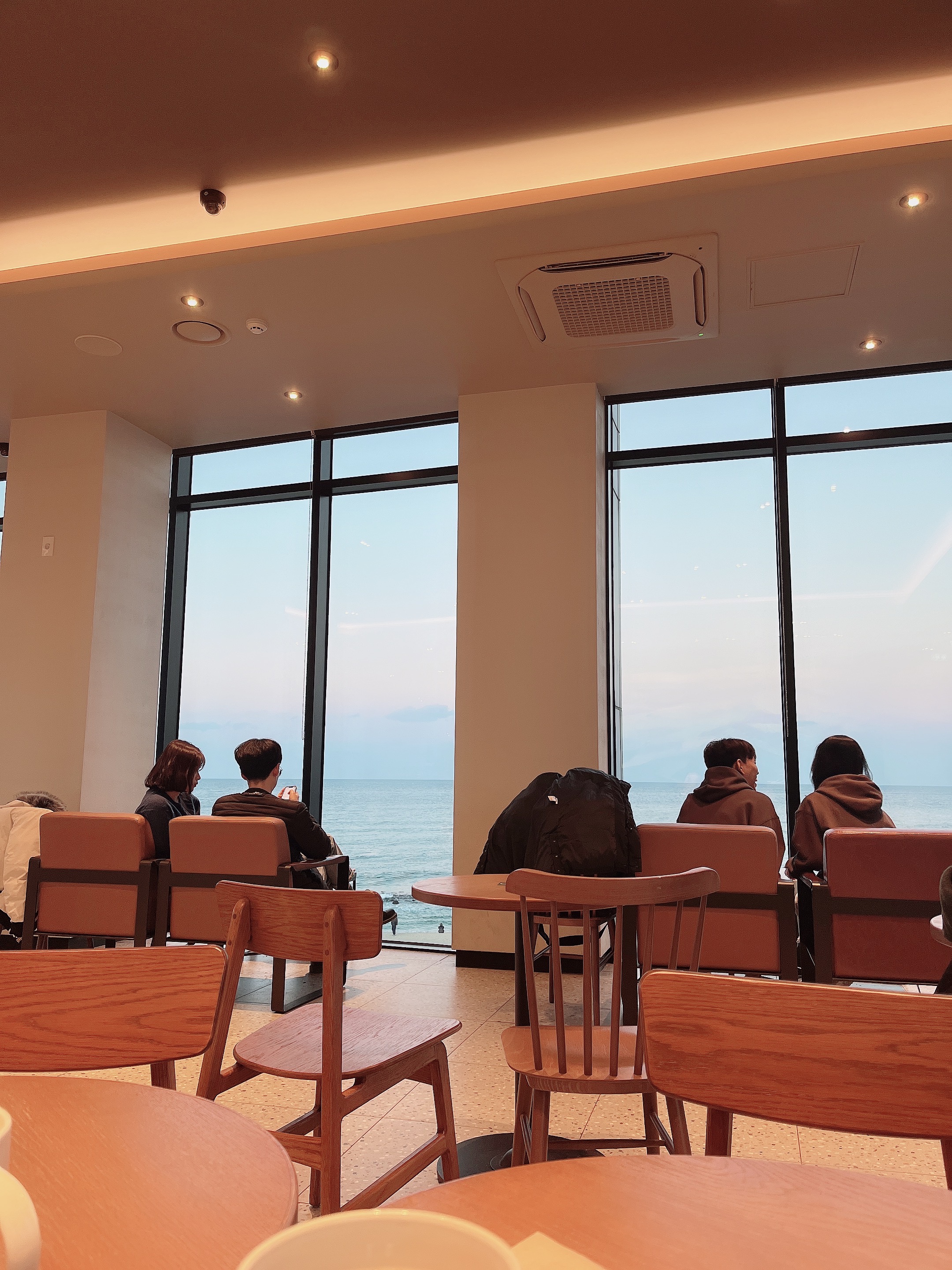 최근에 많이 유명해진 호텔인 씨마크호텔이 근처에 있고, 조망이 좋은 카페들도 몇 군데 찾아볼 수 있습니다. 저는 그중에서 스타벅스를 가봤는데, 자리는 3층까지 있고, 역시나 바다뷰를 바라보고 앉는 자리가 평일인데도 불구하고 꽉 찼습니다. 통유리 밖으로 보이는 푸른 바다가 그림같이 예쁘네요.