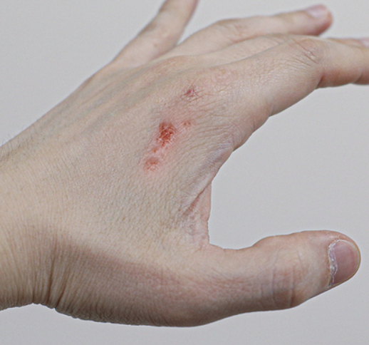 이렇게 인설로 덮인 손바닥만 한 판의 형태를 건선 초기 증상의 대표적인 형태로 보고 있으며 이 인설이 제거가 되면서 점점 출혈이 생기게 됩니다.