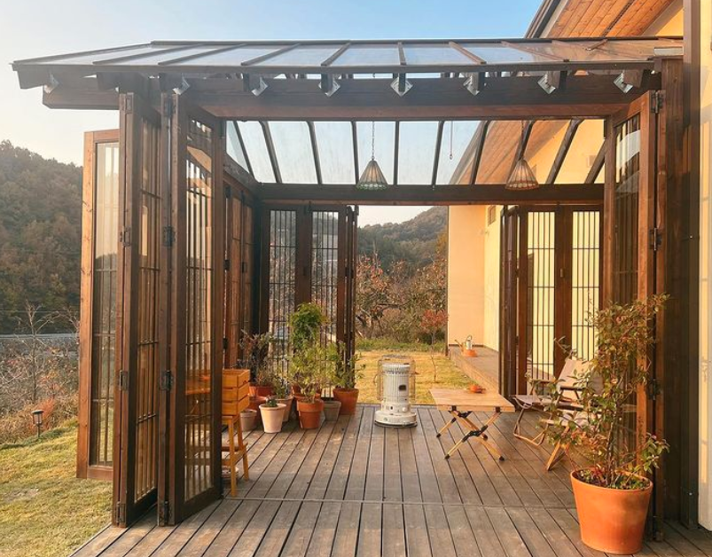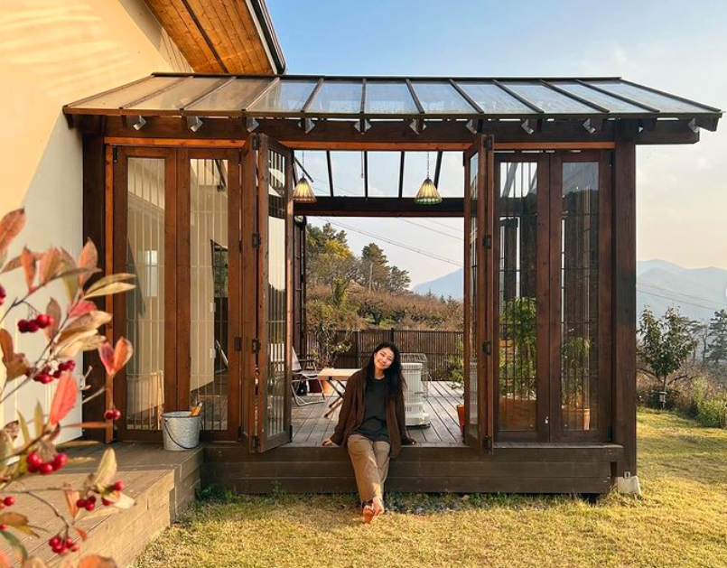 이곳 1층의 썬룸은 없던 공간이지만 반려동물의 겨울나기를 위해서 만들어진 공간이라고 하는데요. 숲이 그려진 엄청 큰 액자를 보는 듯한 느낌이 들었어요. 이곳에서 낮에는 앉아서 풀멍하고, 저녁에는 별을 보고, 아침에는 조식을 먹고 다양한 용도로 이용할 수 있는 최고의 힐링장소인 것 같아요.
