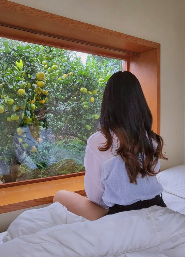 통창밖으로 보이는 감귤나무는 숙소의 우드 계열의 색상과 잘 어우러져 안락하고 편안한 느낌을 자아내는 것 같습니다. 감귤나무 숲속에 들어와 있는 것 같은 이 느낌은 제주도에서 특히 이 폴개우영에서만 느낄 수 있지 않을까 합니다.