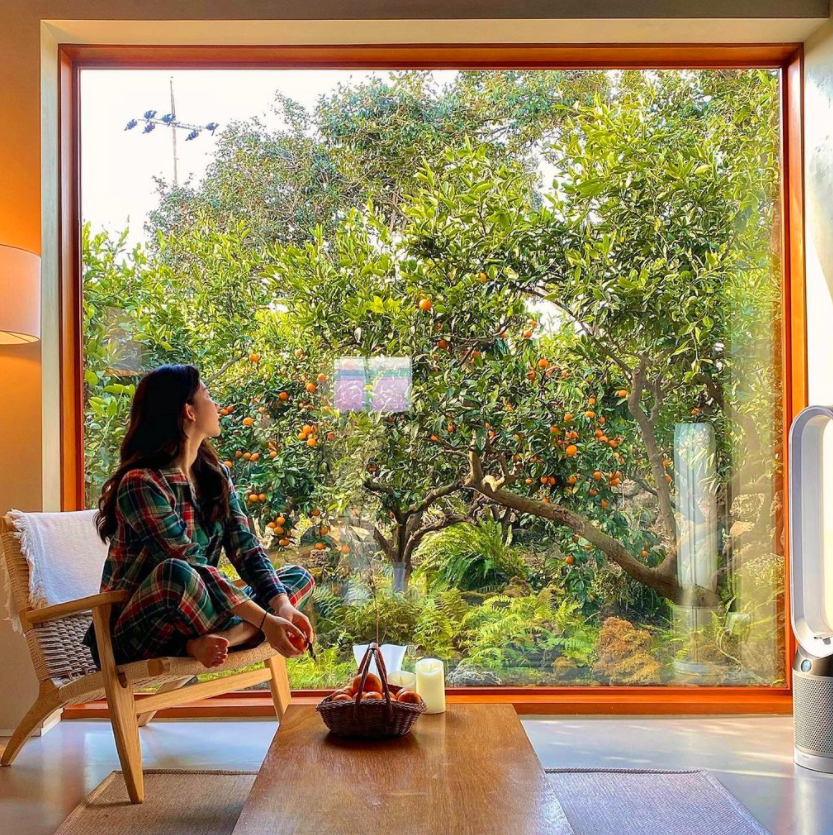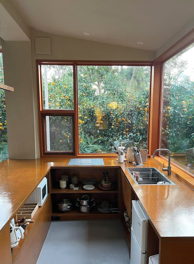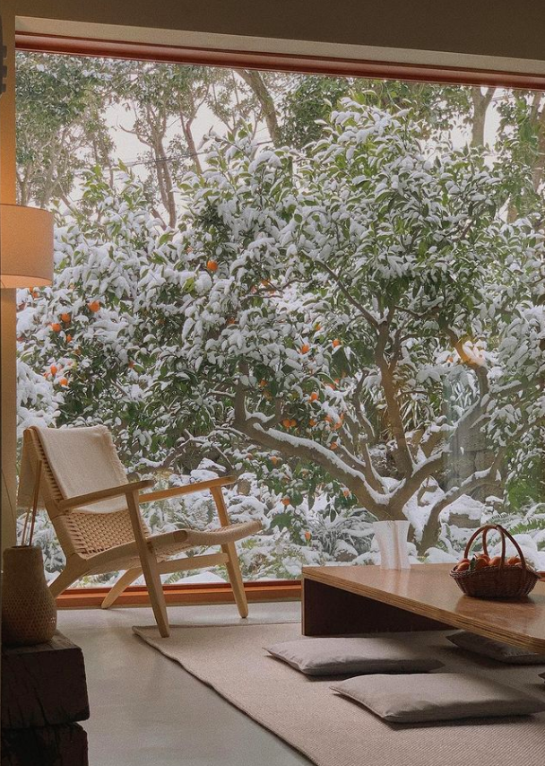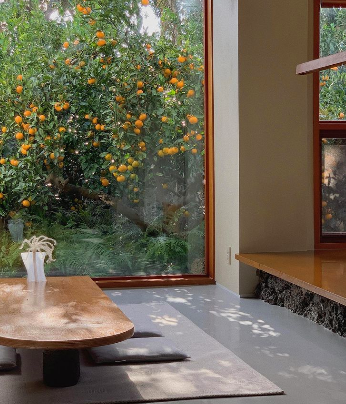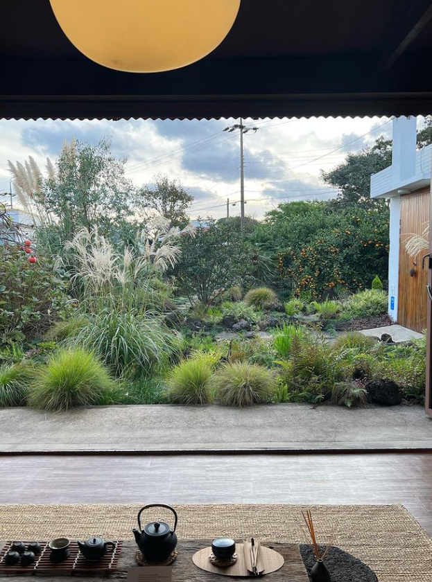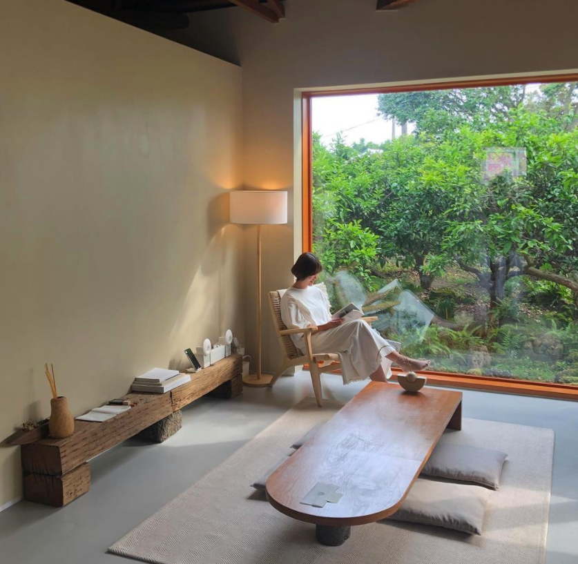 통창밖으로 보이는 감귤나무는 숙소의 우드 계열의 색상과 잘 어우러져 안락하고 편안한 느낌을 자아내는 것 같습니다. 감귤나무 숲속에 들어와 있는 것 같은 이 느낌은 제주도에서 특히 이 폴개우영에서만 느낄 수 있지 않을까 합니다.
