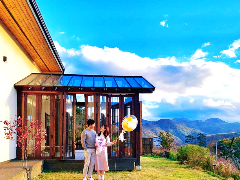 주변이 온통 산으로 둘러싸여 있어서 맑은 공기와 함께 하는 기분, 정원에는 나무와 풀들이 알록달록 정성스럽게 가꾸어져 있어서 예쁜 사진도 많이 찍을 수 있답니다.