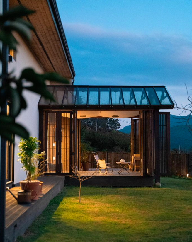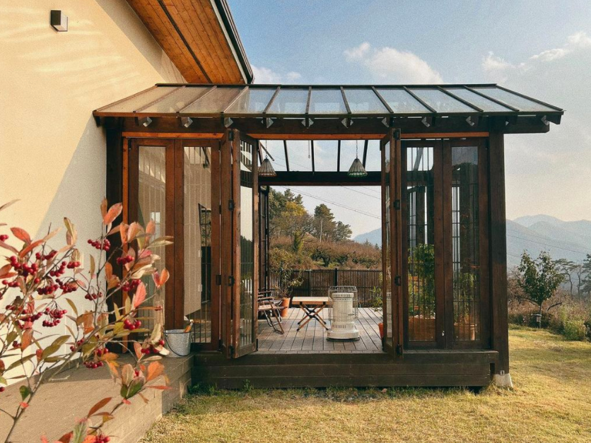 이곳 1층의 썬룸은 없던 공간이지만 반려동물의 겨울나기를 위해서 만들어진 공간이라고 하는데요. 숲이 그려진 엄청 큰 액자를 보는 듯한 느낌이 들었어요. 이곳에서 낮에는 앉아서 풀멍하고, 저녁에는 별을 보고, 아침에는 조식을 먹고 다양한 용도로 이용할 수 있는 최고의 힐링장소인 것 같아요.