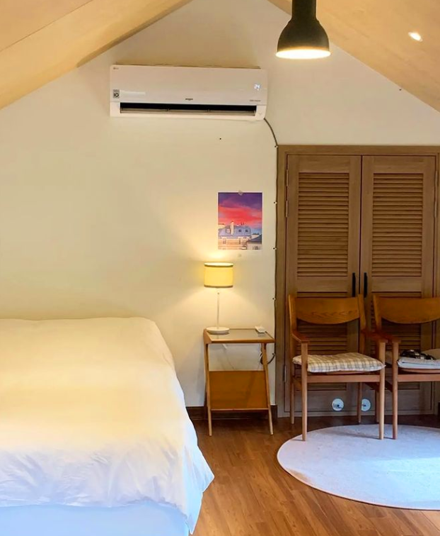 2층에는 이렇게 침실이 있는데, 사방으로 창도 많이 있어서 햇살도 잘 들어오고 환기로 잘 시킬 수 있답니다. 방도 꽤 넓고 오디오도 굉장히 좋은 것이 비치되어 있어서 하루의 시작과 마무리를 아름다운 음악과 함께 해도 낭만적일 것 같아요.
