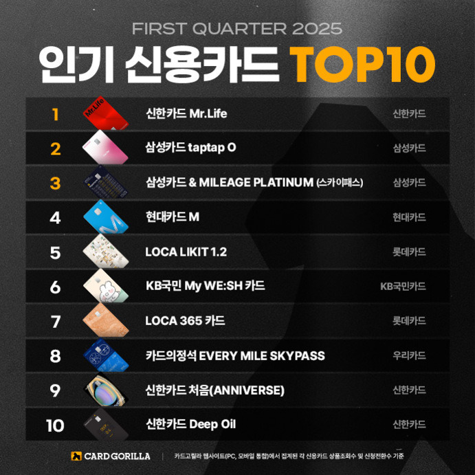 2025년 1분기 인기 신용카드 TOP10 순위 - KB국민 My WE:SH 카드가 6위에 랭크