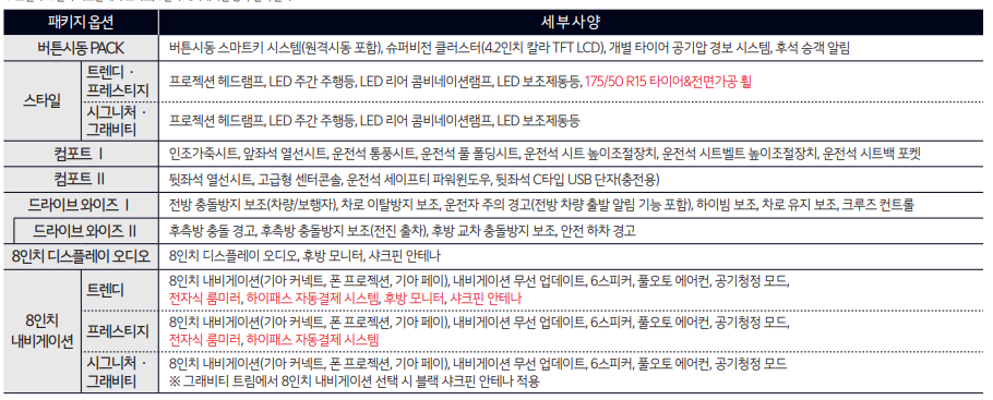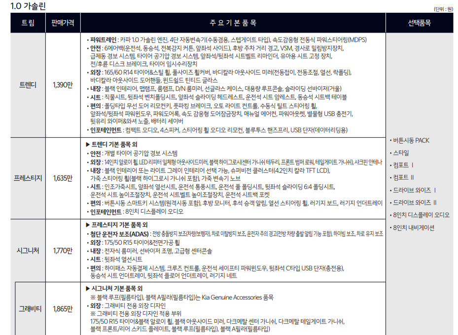 주요 기본 품목이 아래와 같이 구성되어 있고, 트림과 주요 기본 품목에 따라서 가격이 아래와 같이 책정되어 있으니 자세히 살펴보시기를 바랍니다.