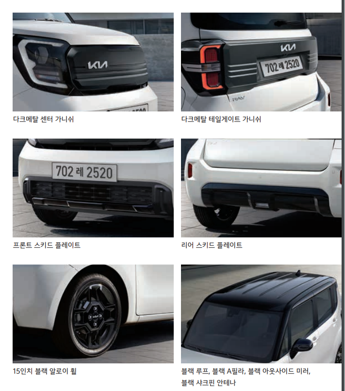 2024년 레이 디자인, 다크메탈 센터 가니쉬와 테일게이트 가니쉬, 전·후면 스키드 플레이트와 블랙 알로이 휠 등 다크 포인트 컬러를 적용해 Ray에 단단한 인상을 더합니다.