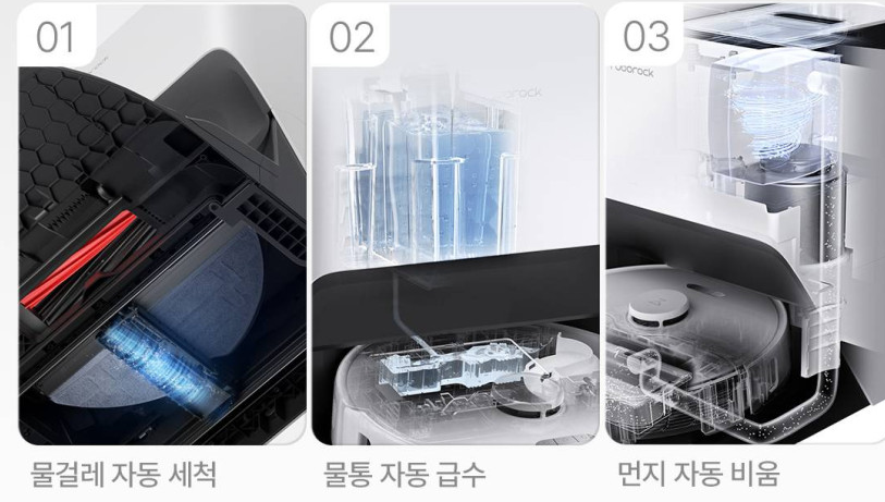 또한 물걸레 기능도 있는데 물걸레 청소 할 때에는 청수통에서 물을 자동으로 급수하고 청소 후에는 또 우수통을 물을 배출시키며, 걸레를 세척 그리고 건조까지 끝내줍니다.