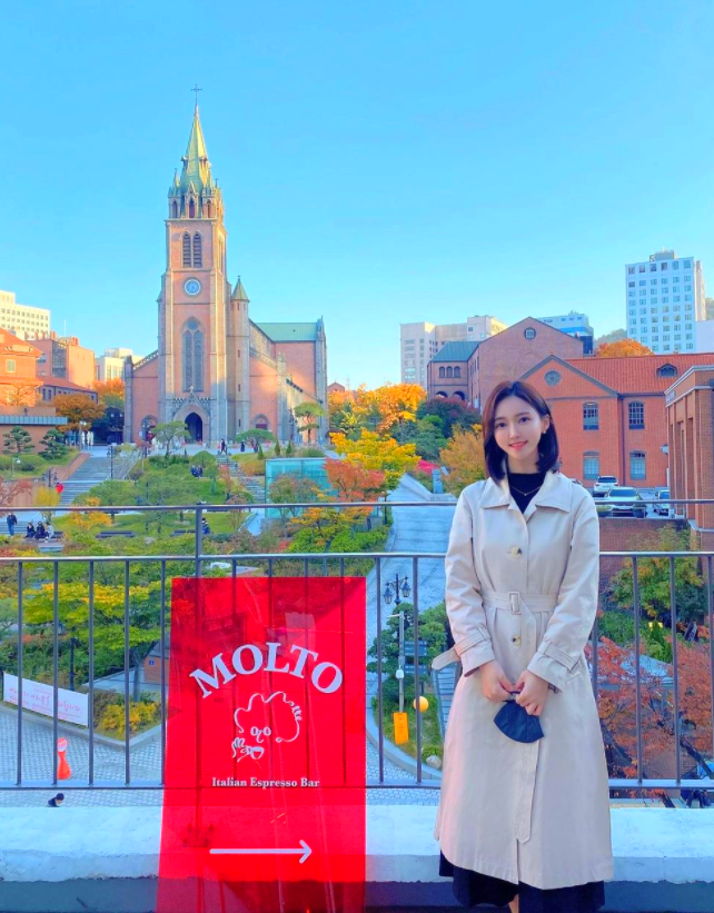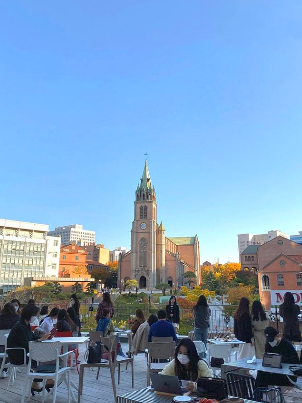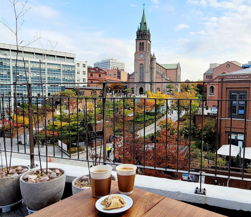 단풍이 아름답게 진 명동성당뷰를 뒤로하고 찍는 사진은 그야말로 그림이 따로 없는 것 같습니다. 실내좌석보다는 야외 테라스 좌석이 인기가 많아서 웨이팅이 있을 수 있으니, 한가한 시간에 가보시면 테라스 명당에 앉아서 이탈리아 노천카페의 느낌을 맘껏 즐기실 수 있을 것 같아요.