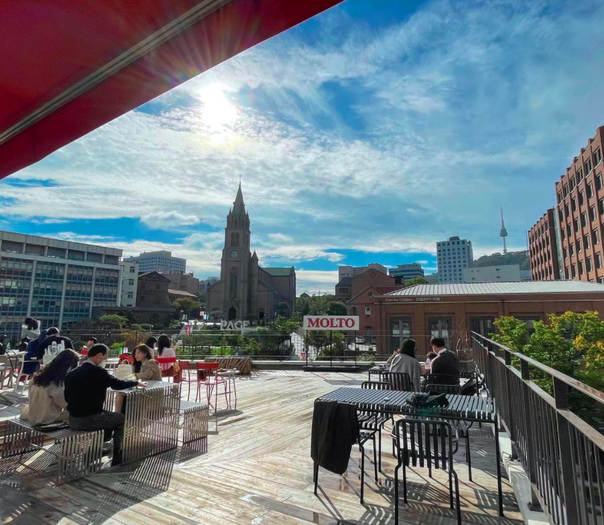 실제로 이태리 Pulia 지방의 식자재를 사용하고 커피 원두와 음료, 디저트까지 완벽하게 이탈리아의 본토 느낌을 구현한 이곳은 그야말로 유럽 감성에 목말라 있는 우리들로 하여금 이탈리아로 여행 온 것 같은 느낌을 주고 있는 것 같습니다. 명동성당과 멀리 남산뷰를 모두 품은 이곳은 그야말로 명당 중 명당!