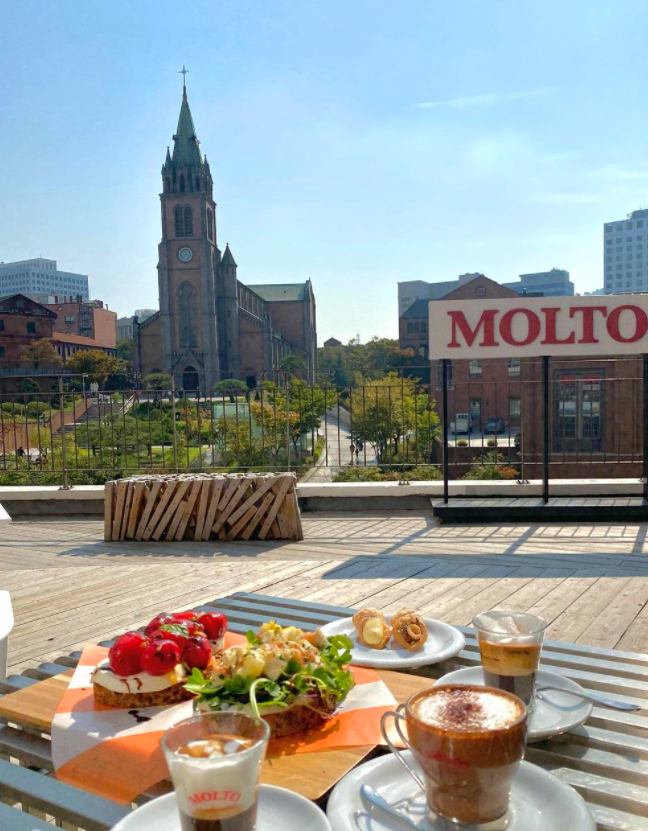 명동성당 앞에 자리 잡은 이탈리안 감성 충만 카페 몰또이탈리안에스프레소바입니다. 도심 한가운데서 이탈리아 노천카페를 연상시키는 이곳은 사장님이 실제로 이탈리아 여행 중에 영감을 받아서 실현한 장소라고 하니 꿈을 이루셨네요.