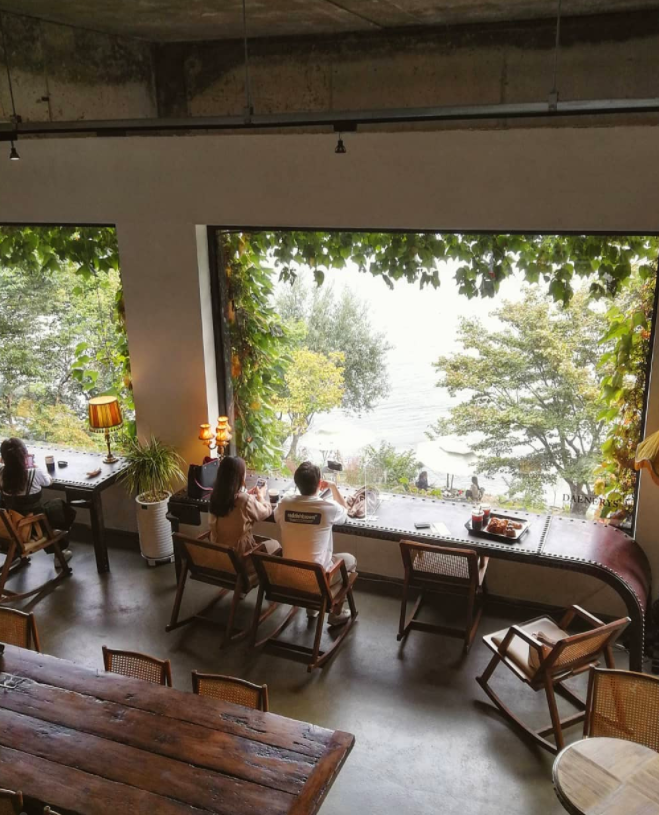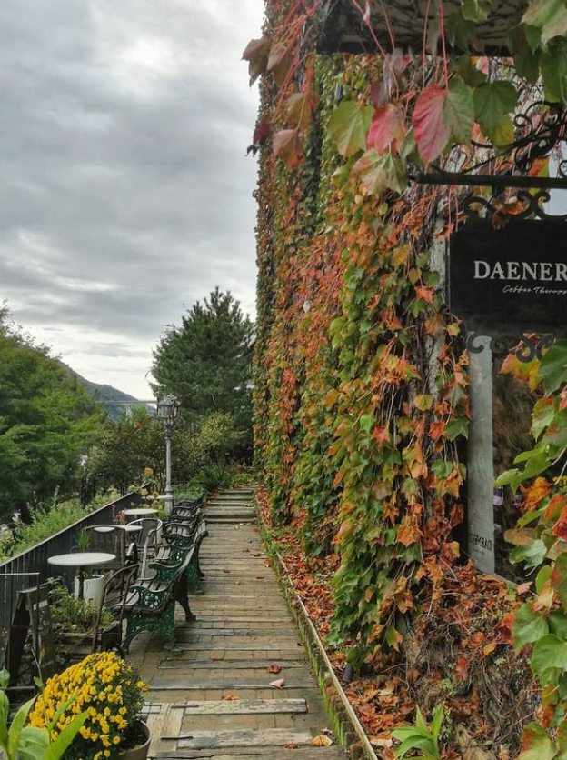 전체적으로 앤틱함과 빈티지함이 돋보이는 카페 인테리어에 단풍이 함께 어우러져 이 카페의 고유의 감성이 더 짙어지는 것 같습니다. 앞에 북한강뷰는 더 말할 것도 없이 아름다운데요. 이 자리에서 커피를 마시며 책 한 권 읽으면 정말 좋을 것 같지 않나요?