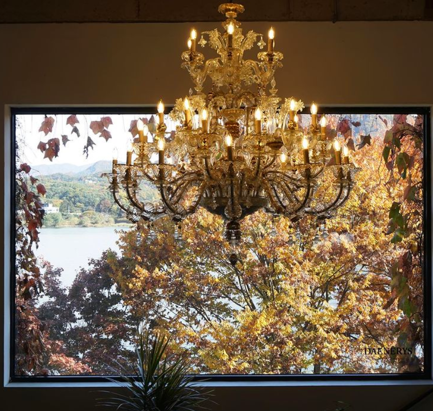 엄청난 크기에 앤틱한 이 조명, 카페를 더 고급스럽고 한층 분위기있게 만들어주고 있는 것 같은데요. 마치 외국 영화에 나오는 성에 있을 법한 조명의 느낌입니다. 은은한 조명 빛이 창문 밖의 단풍과 절묘하게 어우러져 더 아름다운 것 같습니다.