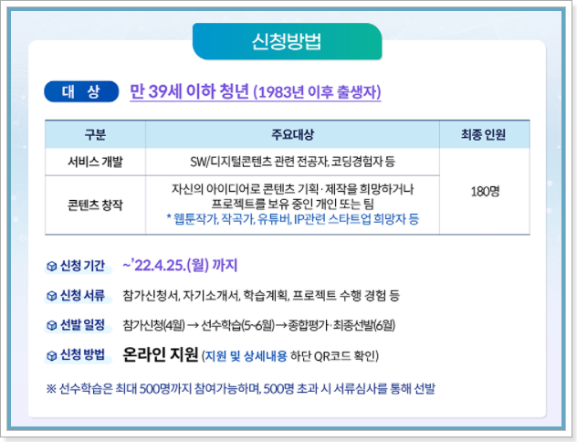 정부에서 획기적으로 기획한 사업이고, 1기 모집인 만큼 교육생, 특히 우수 교육생에게는 참여기업으로의 취업까지 연계될 수도 있는 가능성이 많기 때문에 , 평소에 콘텐츠 창작 등 본인의 아이디어로 사업을 해보길 원하는 청년들은 정말 좋은 기회가 될 것 같다는 생각이 듭니다.