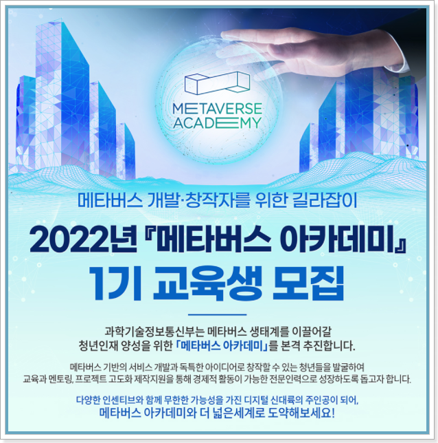 과학기술정보통신부에서 메타버스를 이끌어 나갈 청년인재 양성을 목적으로 한 메타버스 아카데미를 프로그램을 제공합니다. 그동안 관심은 있었으나, 제대로 된 프로그램이나 교육비 문제로 고민이었던 청년들에게는 정말 좋은 기회가 될 것 같습니다.