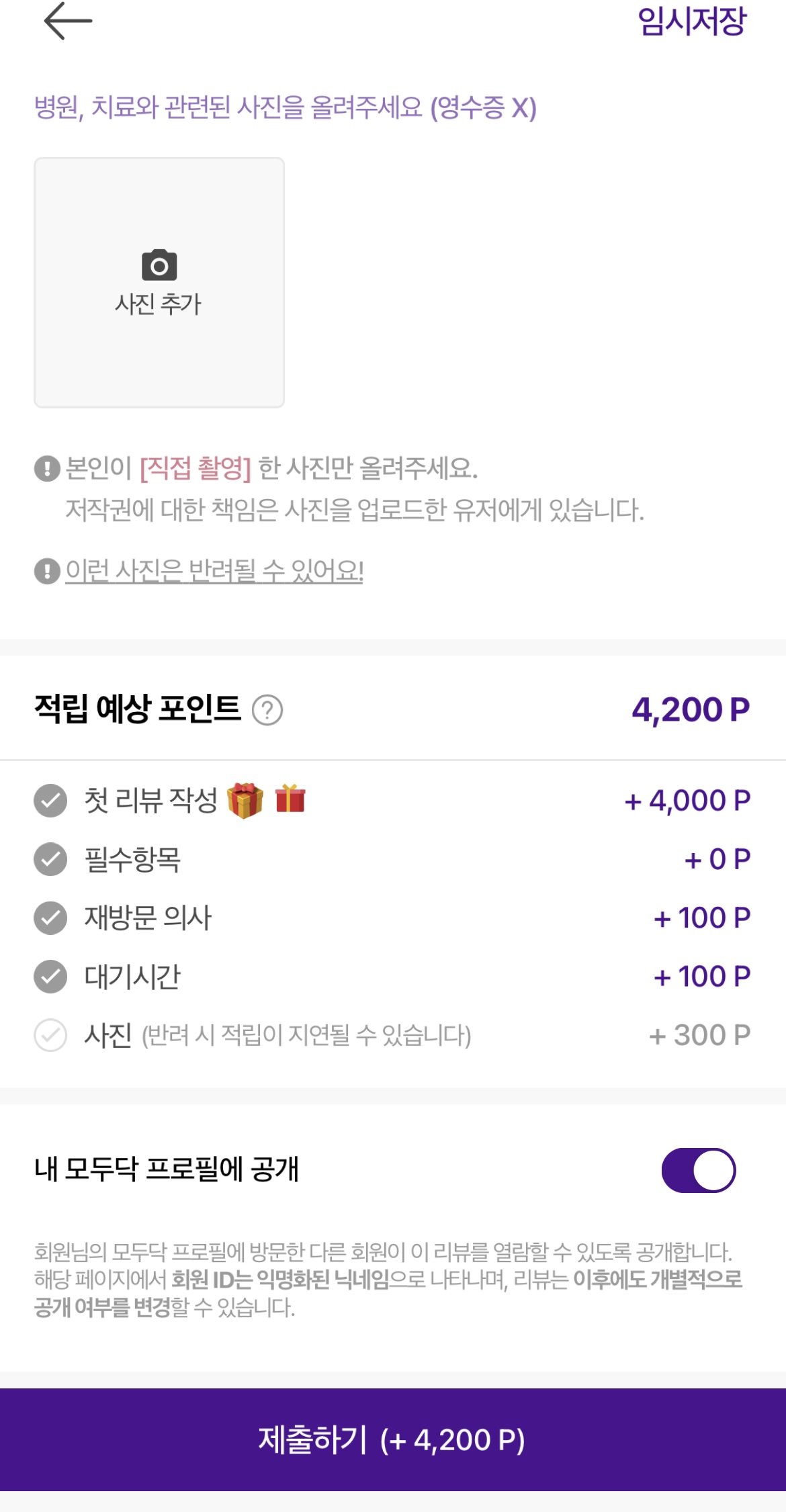 사진추가하는 항목이 있는데 찍어 놓은 사진이 있으면 추가하시면 되시고 없으면 그냥 넘기셔도 됩니다. 필요한 항목을 다 체크를 하시고 제출하기를 누르면 됩니다. 생각보다 금방 끝났는데요. 물론 병원을 다녀오신 적이 많으신 분들은 모든 진료기록에 이와 같은 과정을 거치셔야 하니 좀 시간이 걸리실 수 있는데요. 그래도 포인트를 받을 수 있으니, 열심히 한번 해보아요.