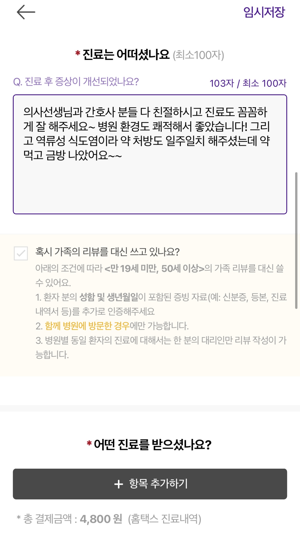 진료의 효과, 의사의 친절, 직원의 친절, 청결함 등을 평가할 수 있는 항목이 있는데, 저는 다 5점 만점으로 평가를 했습니다. 오른쪽에 보시면 진료에 대해서 적는 순서가 있는데 최소 100자만 채우시면 됩니다.