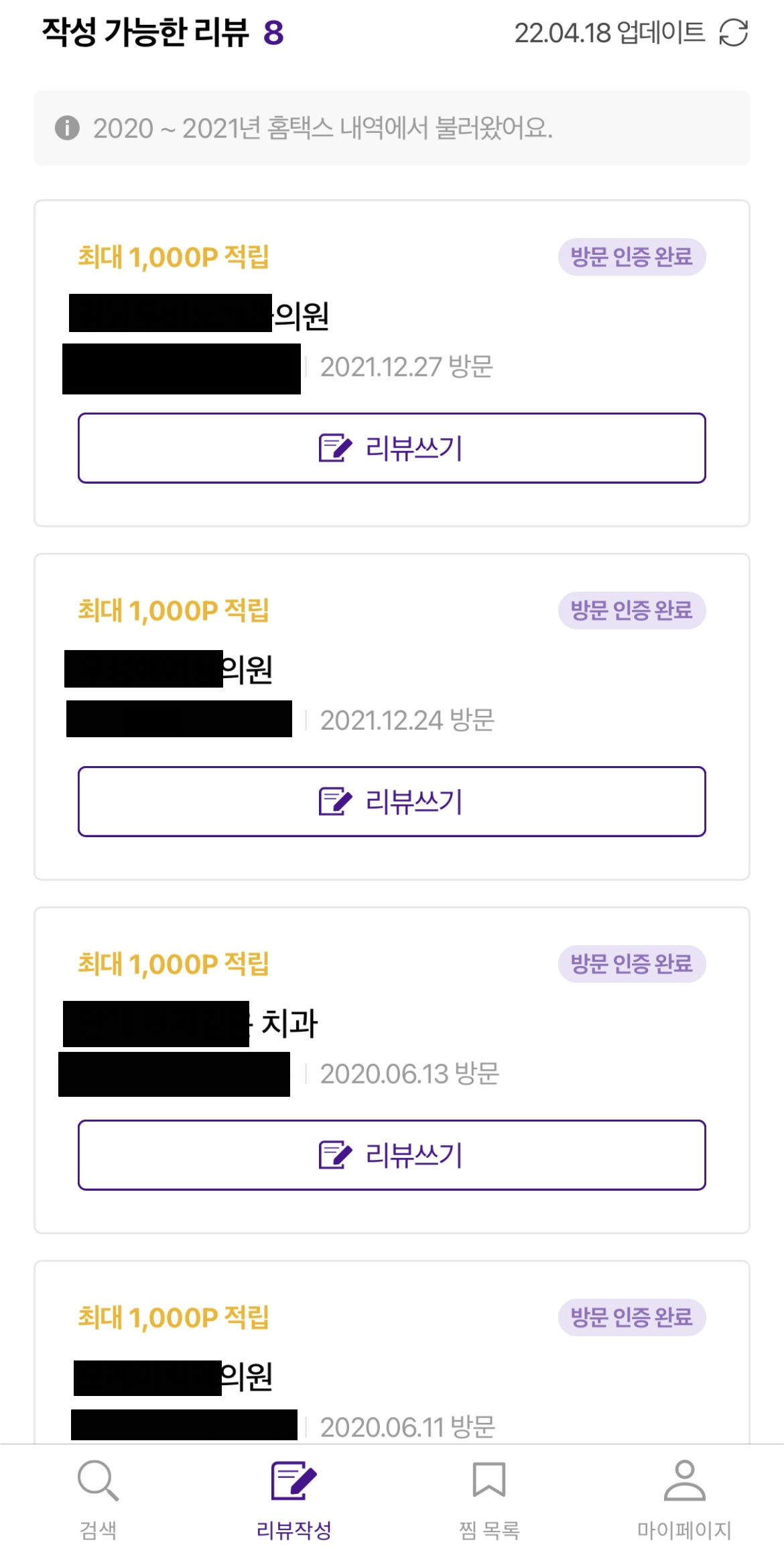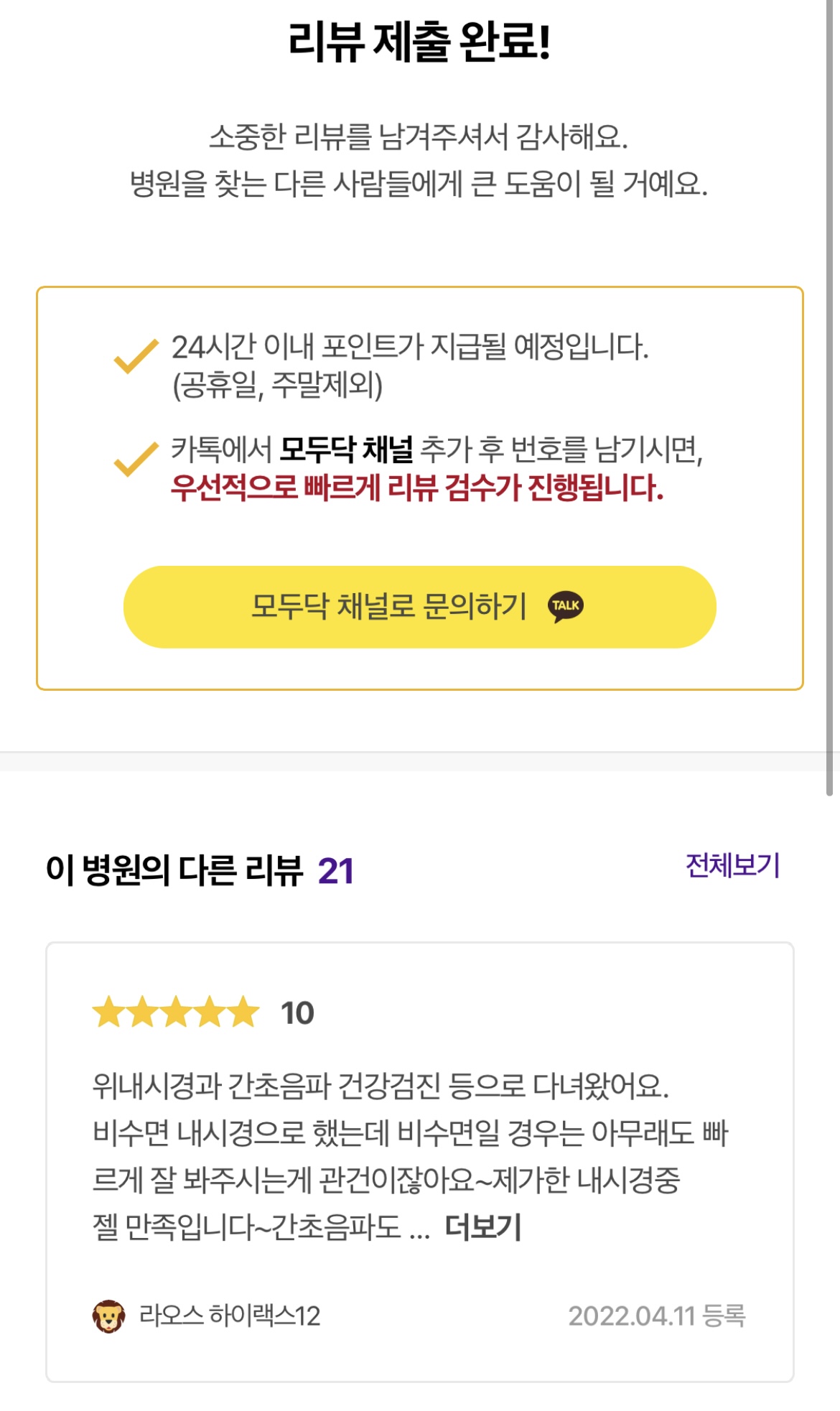 이 어플에서는 최근에 병원에 간 적이 없었어도, 또 당분간 갈 일이 없어도 최근 병원 기록을 볼 수 있습니다. 포인트도 다른 리뷰 앱테크보다는 한 건당 20배 정도 많다고 하니, 이 정도면 할만하지 않을까요?