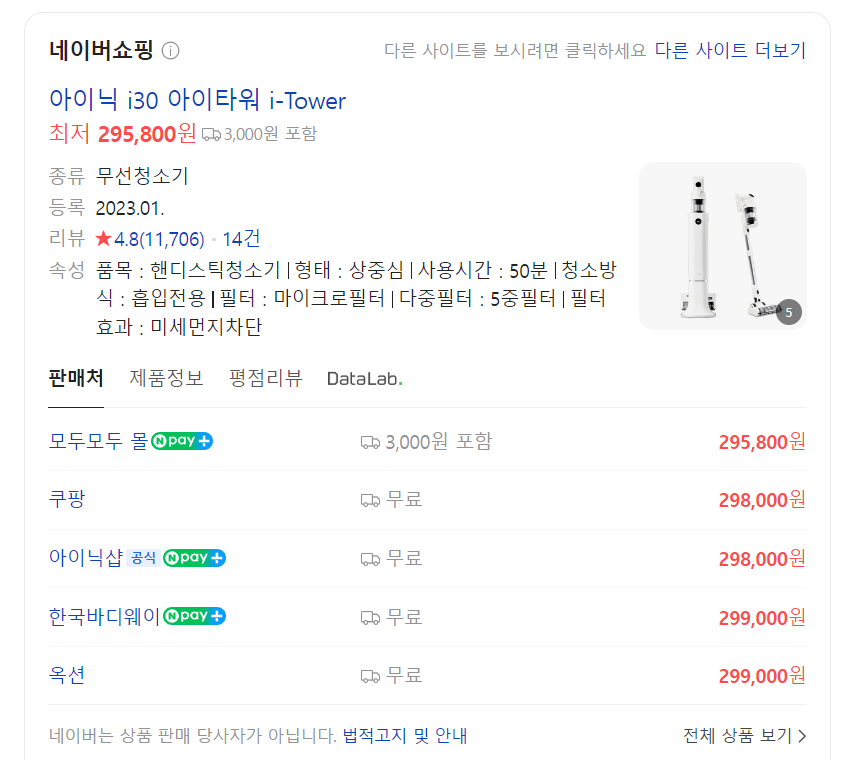 아이닉 i30는 30만 원 조금 안 되는 가격을 형성하고 있습니다. 자동먼지비움에 물걸레 기능까지 더해져 삶의 질이 업그레이드될 것 같은 이 제품 이 정도면 가성비가 굉장히 좋다고 할 수 있겠습니다.