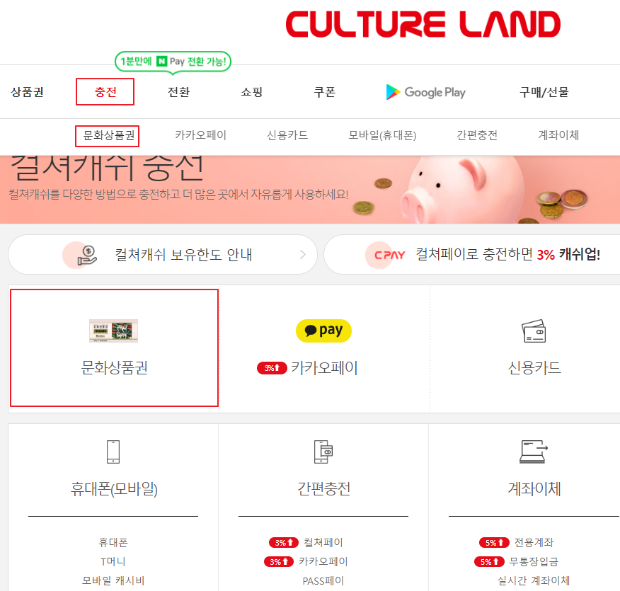 - 컬쳐랜드 홈페이지에 들어가서 로그인한 후 다음과 같이 충천- 문화상품권으로 들어가서 문화상품권 PIN 번호 또는 모바일 상품권 바코드를 입력합니다.