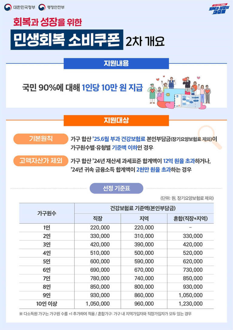 2차 민생회복지원금 대상자 여부는 국민건강보험공단 웹사이트나 카드사 앱을 통해 간편하게 확인할 수 있습니다. 지원 대상은 2025년 6월 건강보험료 본인부담금을 기준으로 선별되며, 가구원 수에 따라 기준액이 다르게 적용됩니다.