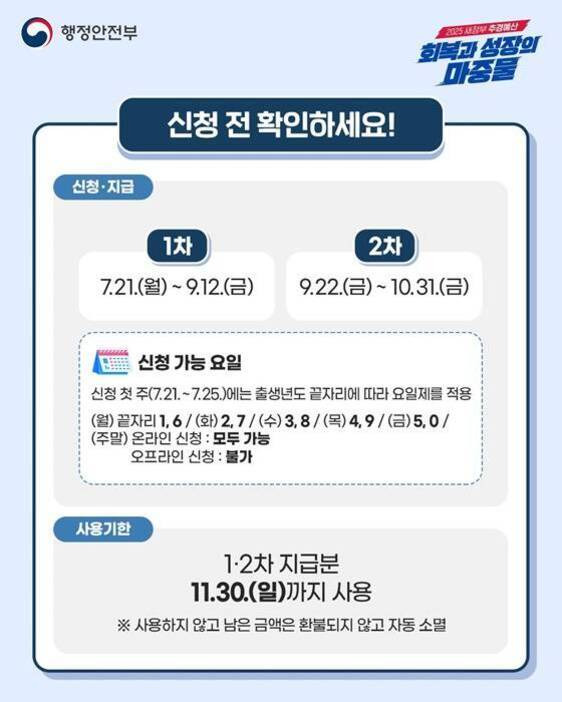온라인 신청 시 유의사항으로는 본인 명의의 휴대폰이나 공동인증서가 필요하며, 신청 첫 주에는 출생연도 끝자리에 따른 요일제가 적용된다는 점을 기억하시기 바랍니다.