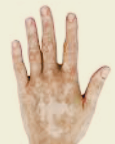 이러한 흰색 반점이 얼굴과 목, 머리카락과 손가락, 팔꿈치 등에서 나타날 수 있습니다. 눈썹이나 머리카락에서는 탈색이 나타나기도 합니다.
