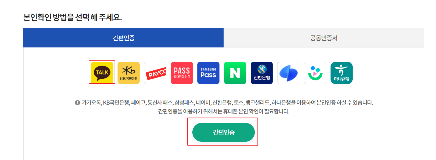 이제는 본인인증을 해야 합니다. 여기서 바로 간편 인증을 누르면 되는데요. 저는 가장 많이 쓰는 카카오톡으로 간편인증을 하도록 하겠습니다.
