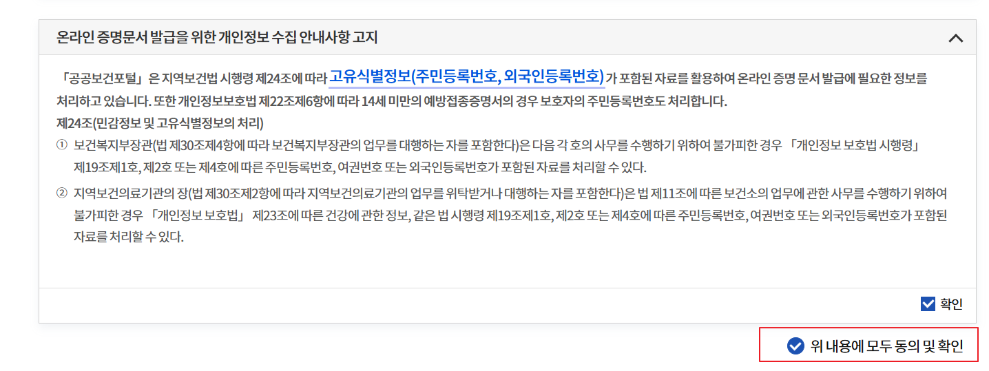 여기서는 발급 전 유의사항과 안내사항을 고지하고 있는데요. 위 내용에 모두 동의 및 확인을 클릭합니다.