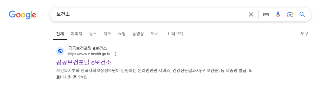 구글에 보건소를 입력합니다. 그러면 아래와 같이 가장 위쪽에 공공보건포털 e보건소가 있습니다. 여기로 들어갑니다.