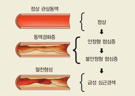 심근경색은 심혈관 질환 중에서도 고위험 질환으로 심장 근육에 혈액을 공급하는 관상동맥이 갑자기 막혀 심장 근육의 기능이 정지된 상태를 말합니다. 심장혈관인 관상동맥은 3개로 이루어져 있는데 이중 어느 하나라도 급성으로 막히는 경우에 심장에 영양 공급과 산소의 공급이 줄어들어서 위와 같은 상황이 생기게 됩니다.
