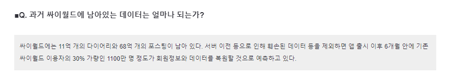 로그인을 해서 들어가보니 세상에.. 아무것도 없었습니다. 저는 사진첩과 다이어리, 방명록 등이 다 보존이 되어있을 줄 알았는데, 아무것도 없더라고요. 실망감을 안고 검색을 한 결과, 현재 복구 중에 있고, 모든 데이터가 복구가 되기까지는 꽤 많은 시간이 걸릴 것으로 예상이 되고 있다고 합니다. 우선 앞으로 6개월 안에 기존 이용자의 30%가량인 1100만 명의 회원정보와 테이터가 복구될 것이라고 하니, 모든 이용자의 데이터가 복구가 되려면 1년 이상의 기간이 걸리지 않을까 싶습니다.