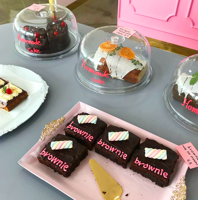 역대급 비주얼의 케이크들이 한 쪽에 자리 잡고 있습니다. 진짜 케이크인지 모형인지 헷갈릴 정도로 굉장히 정교하고 섬세한 디자인의 케이크입니다. 전부 다 먹어보고 싶은 비주얼인데요. 그릇과 식기 등 소품 하나하나에도 정성을 기울인 듯한 느낌이 드는 공주풍 카페인 듯합니다. 이런 곳에서 사진을 찍으면 정말 '나도 셀럽?' 인 느낌을 받으실 수 있겠죠?