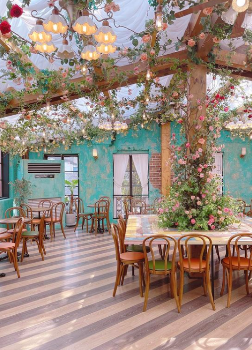 내부는 마치 동화 속의 한 장면을 연상시키는 인테리어인데요. 플라워 카페 같으면서도 이곳에서 앉아있으면 마치 공주가 된 기분이 될 것 같습니다. 1층, 2층, 야외석 이렇게 있는데 각각 색감이 다르니 이것도 다양한 그림을 연출해서 사진에 담을 수 있는 재미가 있겠네요.