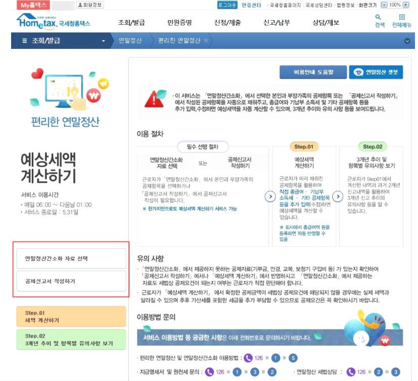3) 예상세액 계산하기에서 연말정산간소화 자료 선택과 공제신고서 작성하기가 뜹니다. 여기서 연말정산간소화 자료 선택을 클릭해서 들어갑니다.