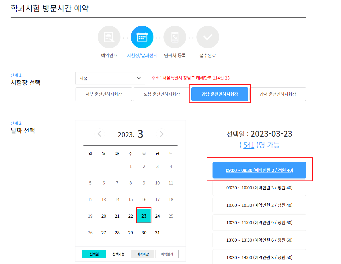 아래의 학과시험 방문시간 예약 부분에 정보를 입력하시고 다음으로 넘어가면 접수가 완료됩니다.