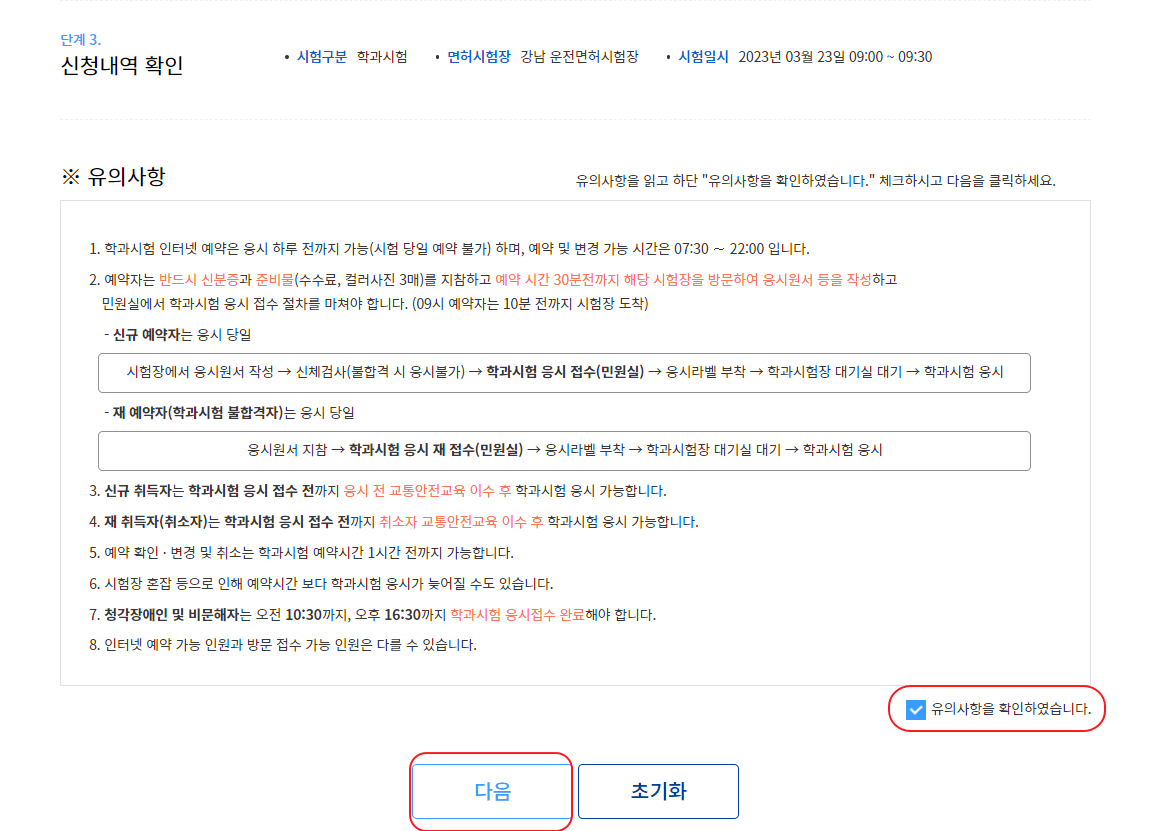 학과시험 방문시간 예약에 관련된 아래의 내용을 읽고 안내문을 확인하였습니다 이 부분에 체크를 하고 다음으로 넘어갑니다.