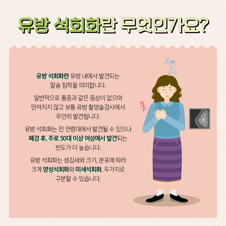 유방 미세석회화는 유방 건강검진에서 자주 발견되는 소견 중 하나입니다. 특히 최근에는 20~30대 젊은 여성에게서도 발견 빈도가 높아지고 있어 주목받고 있습니다. 미세석회화가 발견되면 많은 여성들이 불안해하지만, 모든 미세석회화가 암을 의미하는 것은 아닙니다. 이 글에서는 유방 미세석회화 의미와 정기 추적관리의 중요성, 그리고 알아두어야 할 관리법에 대해 자세히 알아보겠습니다.