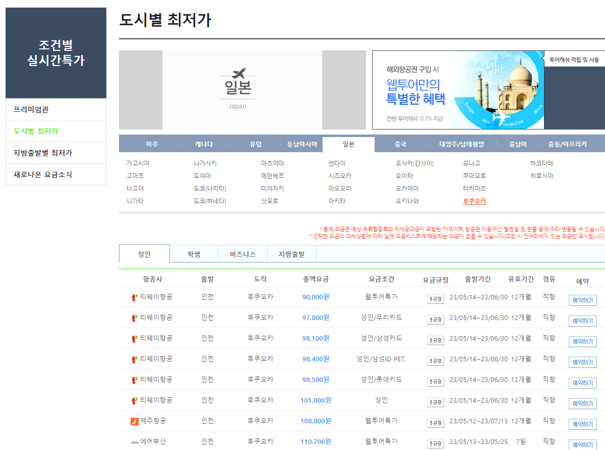 들어가게 되면 도시별 최저가가 뜨게 되는 게 그곳에서 일본 도시별로 최저가를 찾으실 수 있습니다. 항공사와 시간대별로 그리고 카드별 혜택, 웹투어 특가 등으로 분류되어서 일본 항공권 최저가를 알아보실 수 있습니다.