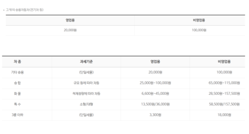 승용차가 아닌 그 밖의 자동차는 별도의 세율을 적용받습니다. 승합차, 화물차, 특수, 3륜 이하는 세금표에 따라서 납부하게 됩니다. 우리가 일반적으로 사용하는 승용차가 가장 많은 세금을 부과받는다고 보시면 됩니다.
