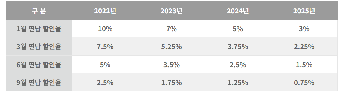 2024년 자동차세 연납을 1월에 신청해서 납부할 경우 연간 자동차세의 5%를 할인받을 수 있습니다. 만약 1월 연납을 못하신 경우에는 3월, 6월, 9월 자동차세 선납신청도 가능한데 할인율은 약 3.75%, 2.5%, 1.25%로 점점 줄어듭니다.