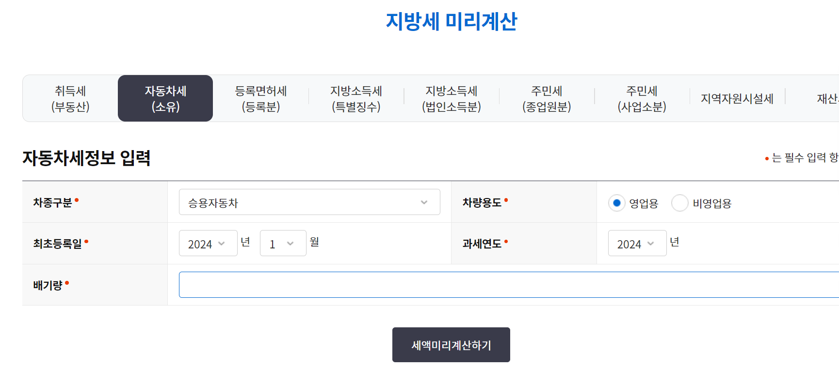 여기서 필요한 정보는 차량 구분, 용도, 최초 등록일, 배기량을 알면 쉽게 계산을 할 수 있습니다.