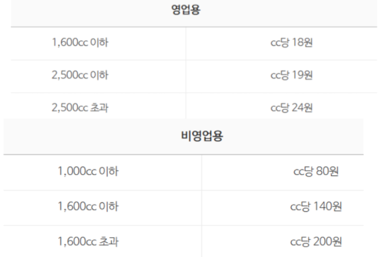 비영업용의 경우는 세액이 더 높습니다. 1000cc 이하는 80원, 1600cc 이하는 140원, 1600cc 초과는 200원입니다. 단, 친환경차는 영업용이 2만 원, 비영업용은 10만 원을 부과받게 됩니다.