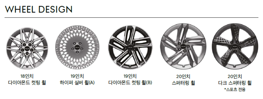 아래는 휠 디자인입니다. 18인치, 19인치, 20인치 이렇게 세 가지가 있고 승차감과 연비를 위해서라면 18인치 휠, 외관적으로 이쁘게 보이고 싶다면 20인치를 선택하시면 좋을 것 같습니다.