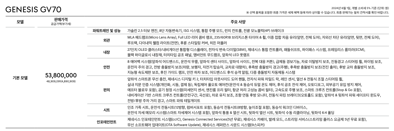 제네시스 gv70 가격표 신차 가격은 5380만 원에서 시작됩니다. 이 가격은 2.5 가솔린 터보 가격이고, 3.5 가솔린 터보 가격은 이 가격에 550만 원이 더해진 5930만 원부터 시작이 됩니다.
